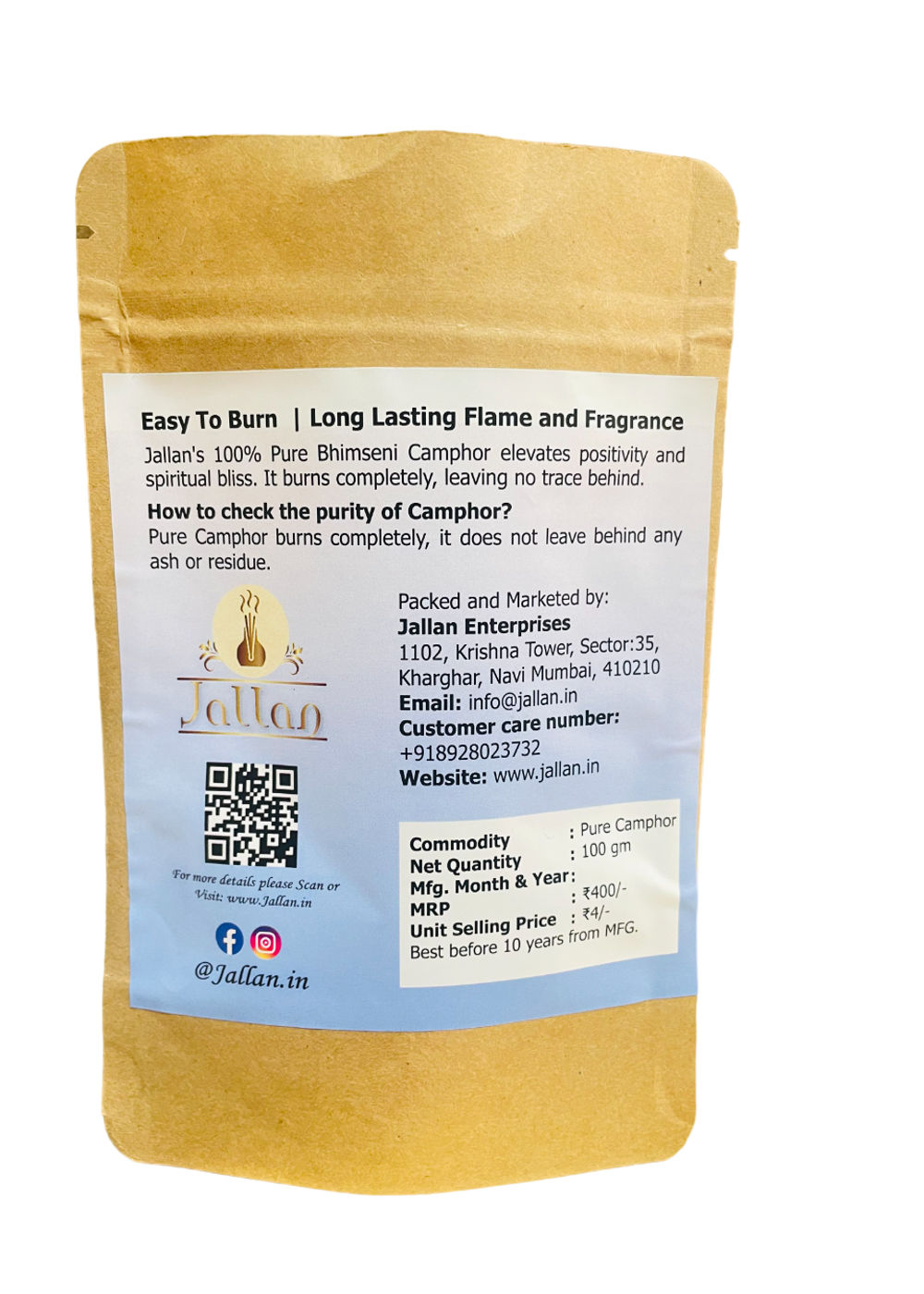 Products / Jallan Pure Natural Bhimseni Camphor|Pack of 2| 100gm Pack each| 100% Organic and Original Kapoor| Purifying & Pleasant Fragrance for Pooja, Hawan, Air Freshener| Use for Camphor Diffuser Electric